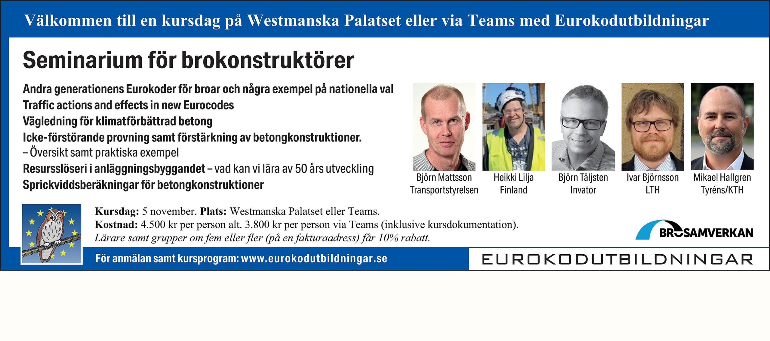Välkommen till en kursdag på Westmanska Palatset eller via Teams med Eurokodutbildningar! Seminarium för brokonstruktörer Andra generationens Eurokoder för broar och några exempel på nationella val Traffic actions and effects in new Eurocodes Vägledning för klimatförbättrad betong Icke-förstörande provning samt förstärkning av betongkonstruktioner. – Översikt samt praktiska exempel Resursslöseri i anläggningsbyggandet – vad kan vi lära av 50 års utveckling [läs mer]
